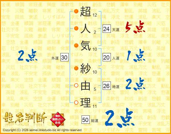 超人気紗由理さんの天運は24画の5点!