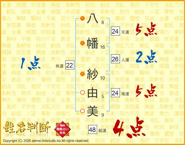 八(8画)幡(16画) 紗(10画)由(5画)美(9画)