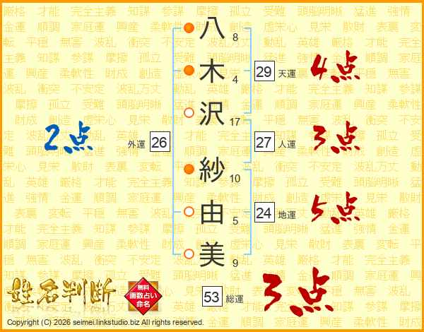 八(8画)木(4画)沢(17画) 紗(10画)由(5画)美(9画)