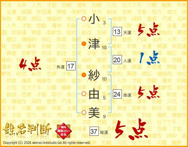 小(3画)津(10画) 紗(10画)由(5画)美(9画)