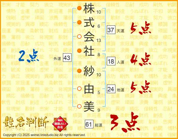 株(10画)式(6画)会(13画)社(8画) 紗(10画)由(5画)美(9画)
