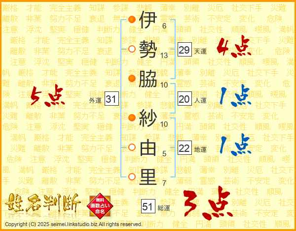伊(6画)勢(13画)脇(10画) 紗(10画)由(5画)里(7画)