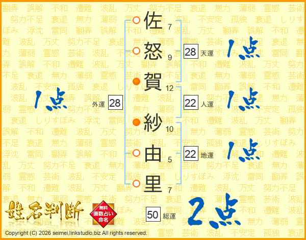 佐(7画)怒(9画)賀(12画) 紗(10画)由(5画)里(7画)