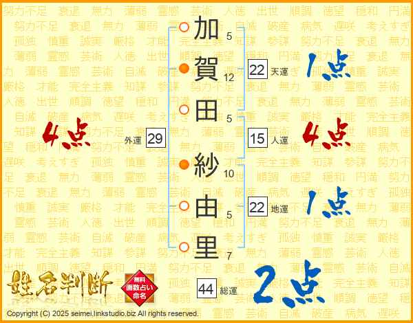 加(5画)賀(12画)田(5画) 紗(10画)由(5画)里(7画)