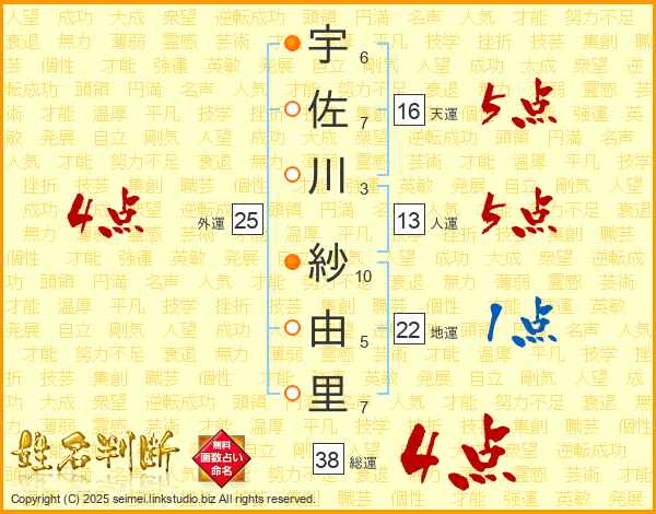 宇佐川紗由里さんの総運は38画の4点!