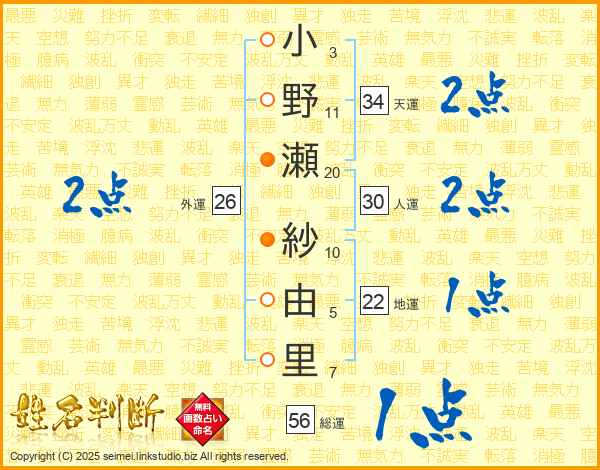 小(3画)野(11画)瀬(20画) 紗(10画)由(5画)里(7画)