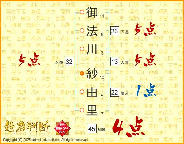 御(11画)法(9画)川(3画) 紗(10画)由(5画)里(7画)