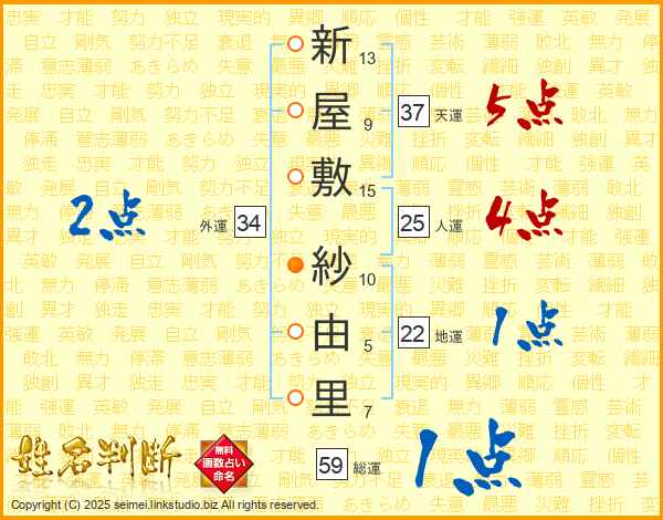新(13画)屋(9画)敷(15画) 紗(10画)由(5画)里(7画)