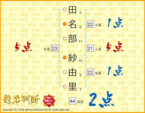田(5画)名(6画)部(11画) 紗(10画)由(5画)里(7画)