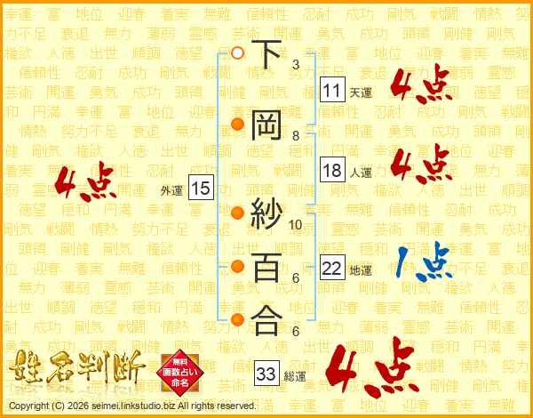 下岡紗百合さんの総運は33画の4点!