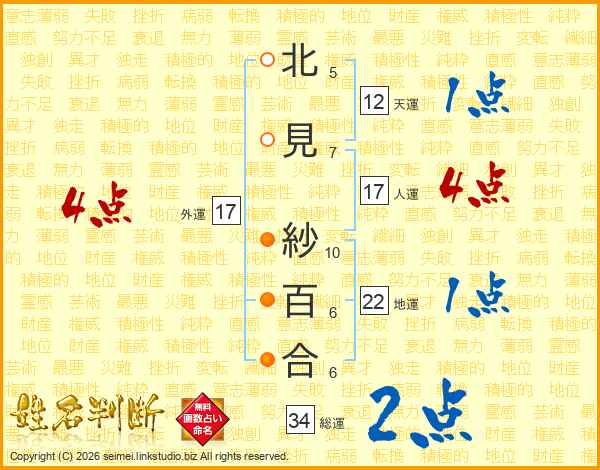 北(5画)見(7画) 紗(10画)百(6画)合(6画)