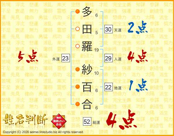 多(6画)田(5画)羅(19画) 紗(10画)百(6画)合(6画)