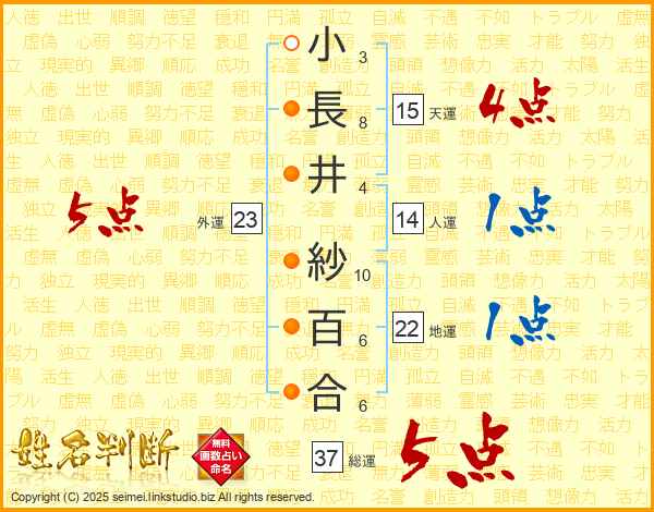 小(3画)長(8画)井(4画) 紗(10画)百(6画)合(6画)