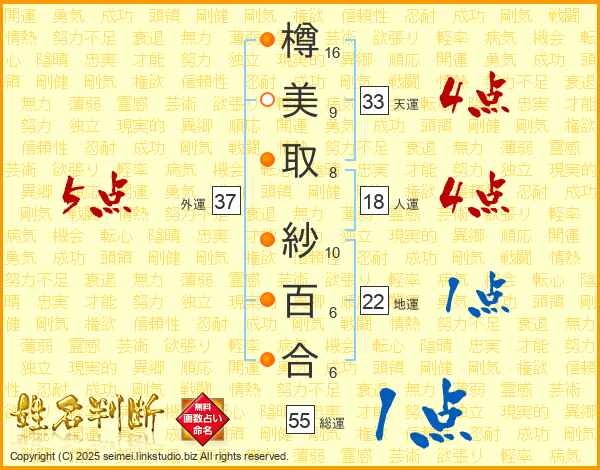 樽(16画)美(9画)取(8画) 紗(10画)百(6画)合(6画)