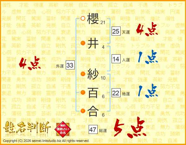 櫻井紗百合さんの総運は47画の5点!