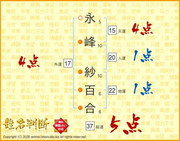 永(5画)峰(10画) 紗(10画)百(6画)合(6画)