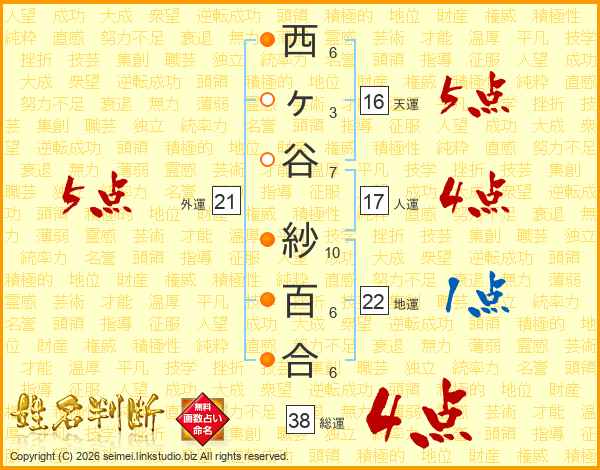 西(6画)ヶ(3画)谷(7画) 紗(10画)百(6画)合(6画)