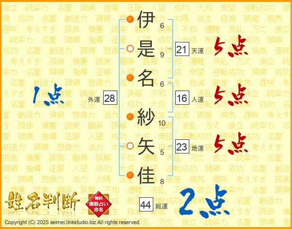 伊(6画)是(9画)名(6画) 紗(10画)矢(5画)佳(8画)