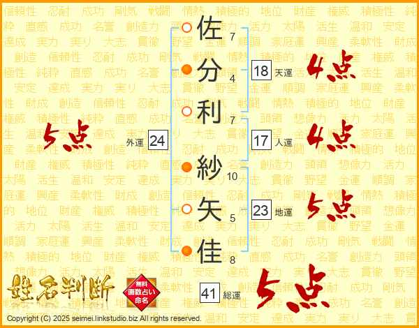 佐(7画)分(4画)利(7画) 紗(10画)矢(5画)佳(8画)