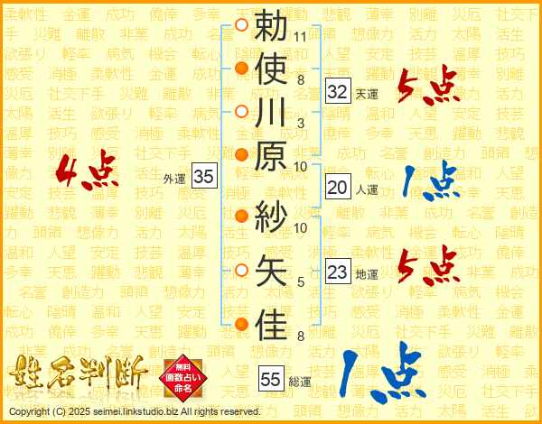 勅使川原紗矢佳さんの外運は35画の4点!