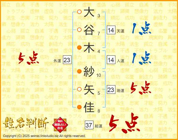 大(3画)谷(7画)木(4画) 紗(10画)矢(5画)佳(8画)