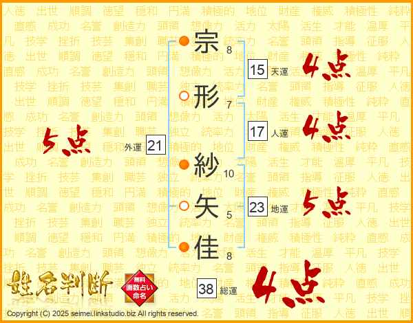 宗形紗矢佳さんの総運は38画の4点!