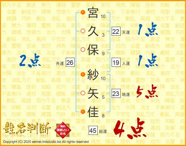 宮(10画)久(3画)保(9画) 紗(10画)矢(5画)佳(8画)