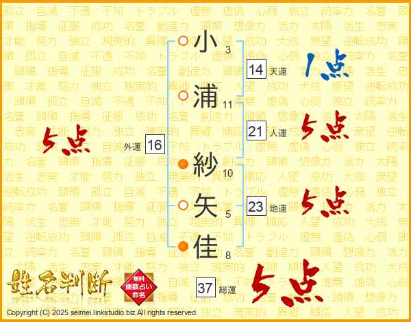 小(3画)浦(11画) 紗(10画)矢(5画)佳(8画)