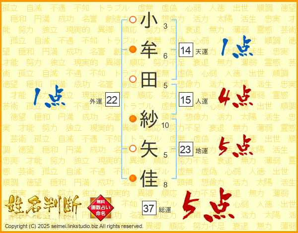 小(3画)牟(6画)田(5画) 紗(10画)矢(5画)佳(8画)