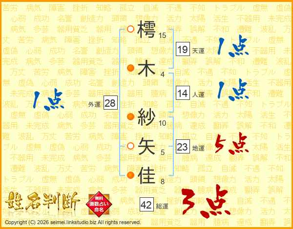 樗(15画)木(4画) 紗(10画)矢(5画)佳(8画)
