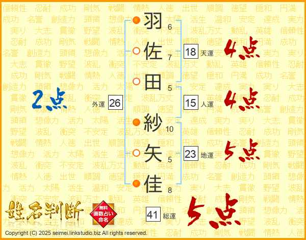 羽佐田紗矢佳さんの総運は41画の5点!