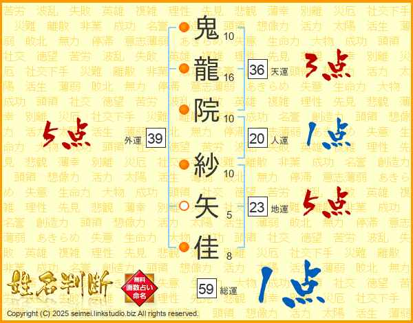 鬼龍院紗矢佳さんの外運は39画の5点!