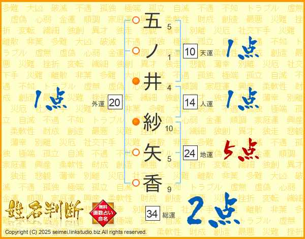 五(5画)ノ(1画)井(4画) 紗(10画)矢(5画)香(9画)
