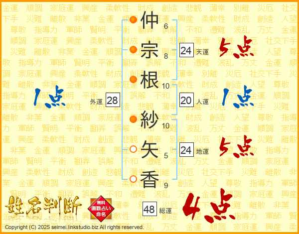 仲(6画)宗(8画)根(10画) 紗(10画)矢(5画)香(9画)