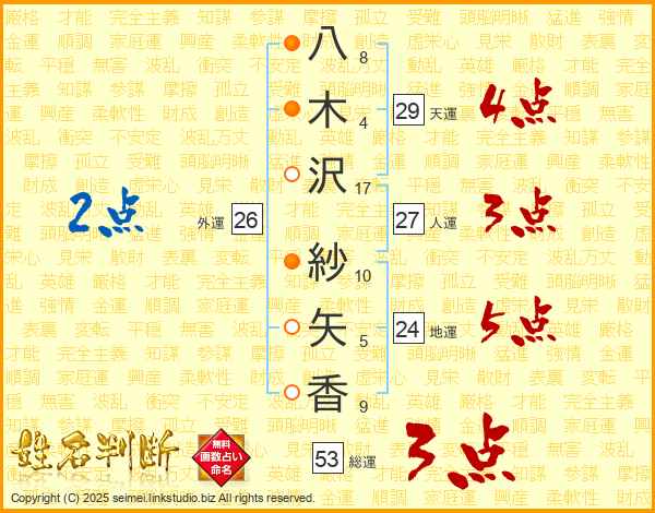 八(8画)木(4画)沢(17画) 紗(10画)矢(5画)香(9画)