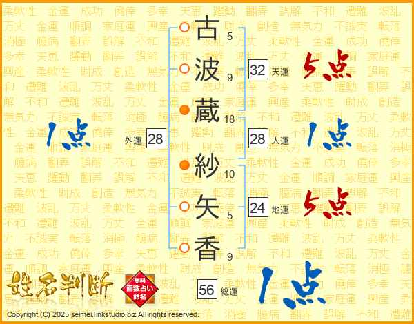 古(5画)波(9画)蔵(18画) 紗(10画)矢(5画)香(9画)