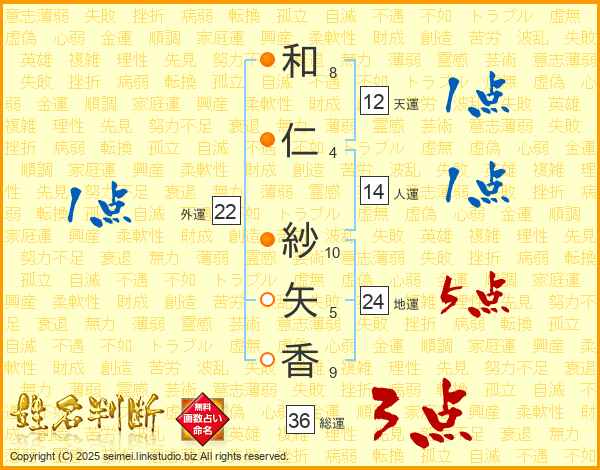 和(8画)仁(4画) 紗(10画)矢(5画)香(9画)