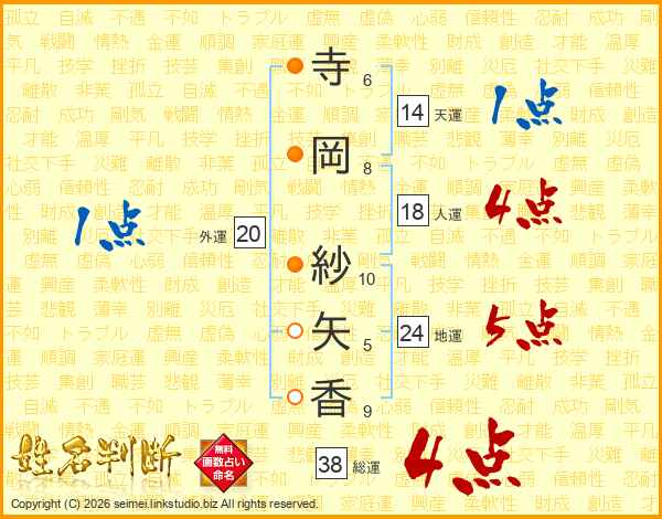 寺(6画)岡(8画) 紗(10画)矢(5画)香(9画)