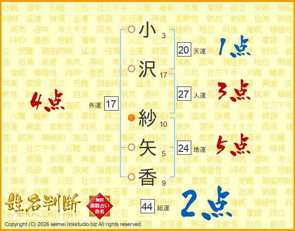 小(3画)沢(17画) 紗(10画)矢(5画)香(9画)