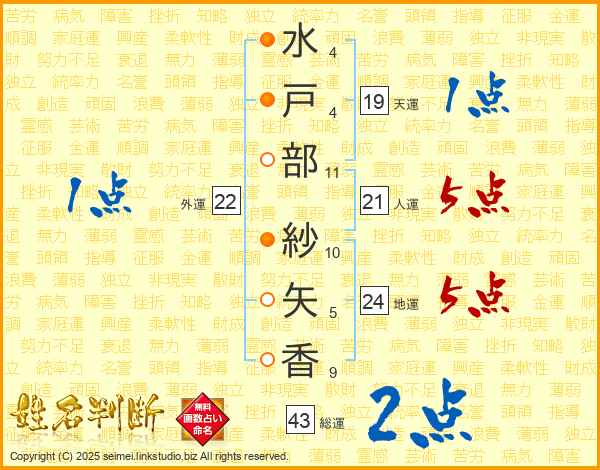 水(4画)戸(4画)部(11画) 紗(10画)矢(5画)香(9画)