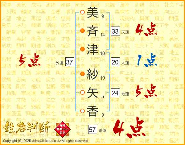 美(9画)斉(14画)津(10画) 紗(10画)矢(5画)香(9画)