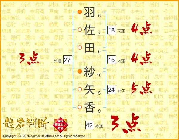 羽(6画)佐(7画)田(5画) 紗(10画)矢(5画)香(9画)