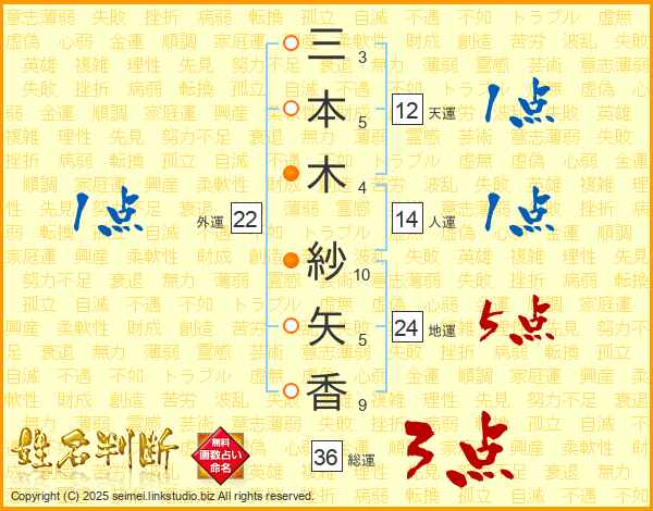 三(3画)本(5画)木(4画) 紗(10画)矢(5画)香(9画)