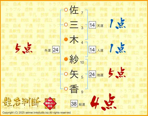 佐(7画)三(3画)木(4画) 紗(10画)矢(5画)香(9画)