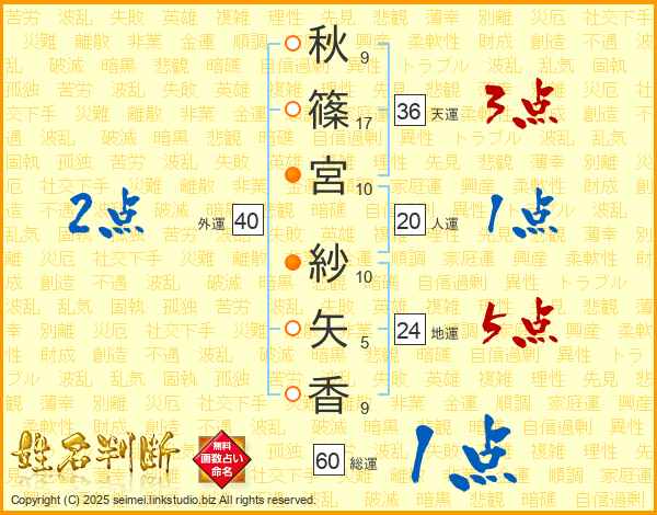 秋(9画)篠(17画)宮(10画) 紗(10画)矢(5画)香(9画)