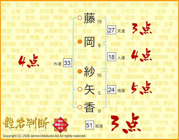 藤(19画)岡(8画) 紗(10画)矢(5画)香(9画)