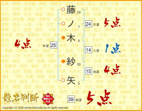藤(19画)ノ(1画)木(4画) 紗(10画)矢(5画)