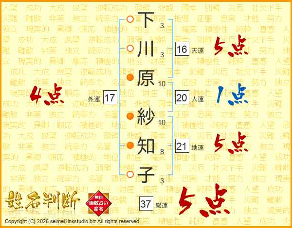 下川原紗知子さんの総運は37画の5点!