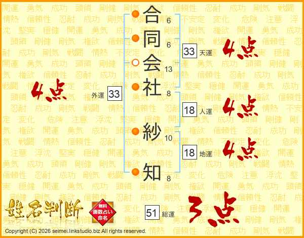 生活面を象徴する運勢です。外部から受ける影響力を表し、結婚運、家庭運や職場、環境への順応性を表します。総運から人運を引いた画数。姓や名が1文字の場合を除く。