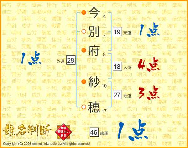 今(4画)別(7画)府(8画) 紗(10画)穂(17画)